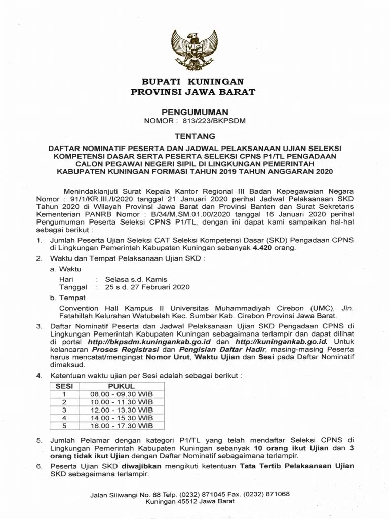 Pengumuman jadwal pelaksanaan skd cpns dan seleksi kompetensi pppk non guru di lingkungan pemkab. Pengumuman jadwal ujian skd, pembagian meja registrasi pengadaan cpns dilingkungan pemkab kuningan formasi tahun 2019 tahun anggaran 2020. Dari pengumuman badan kepegawaian negara (bkn) pusat, skd untuk cpns 2021 serentak dilakukan di seluruh wilayah indonesia mulai dari 2 setember . Ulang peserta seleksi kompetensi dasar (skd) cpns mahkamah agung ri tahun 2021 . Kamis, 14 oktober 2021, 17:00:05 wib.