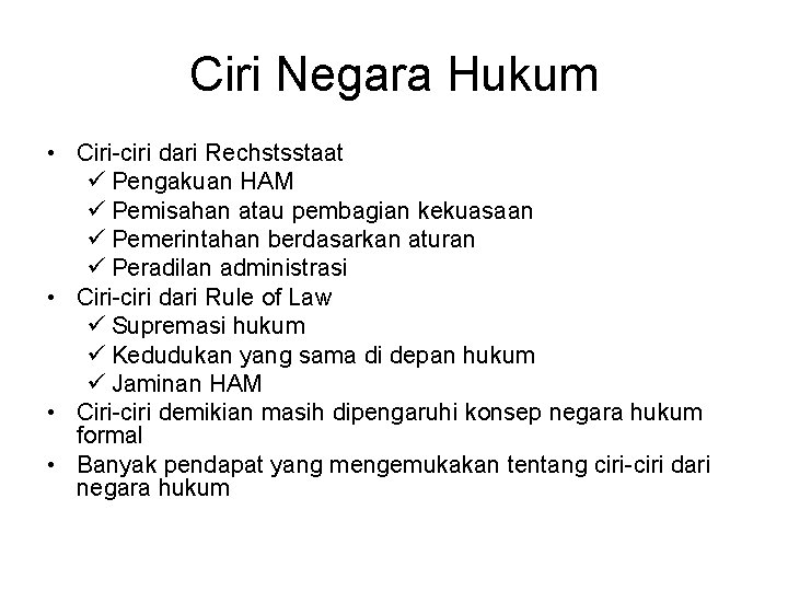 Supremasi hukum (supremacy of law),; Negara hukum formal memiliki ciri bahwa hukum yang berlaku sudah melalui proses kesepakatan antara rakyat dengan pemerintah . Tipe negara hukum materil merupakan pengertian negara hukum dalam arti luas, yang sering di sebut dengan negara hukum modern (modern rechtsstaat). Konsep negara hukum sendiri bersandar pada keyakinan bahwa kekuasaan negara harus dijalankan atas dasar hukum yang adil dan baik. Namun seiring perkembangan zaman, negara hukum formil.